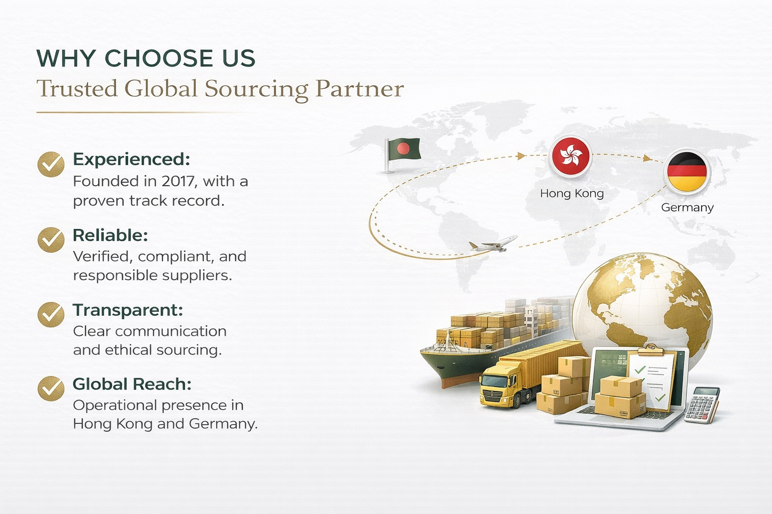 Professional sourcing company connecting European importers, wholesalers, and private-label brands with reliable garment, textile, and jute manufacturers in Bangladesh.